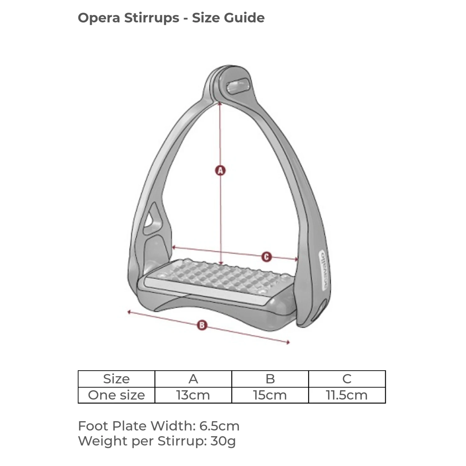 The Opera stirrup creates a more comfortable and secure ride ultimately causing riders to be more correct through the leg. This is due to the new patented loop construction concept from Acavallo which allows both arms of the stirrup to work independently and encourages the the stirrup to adhere to the saddle flap limiting friction between the leg and the stirrup. Stiffness and tension in the hips, knees, ankles and calves if eliminated through the larger stainless steel stirrup pad also providing ultimate grip.