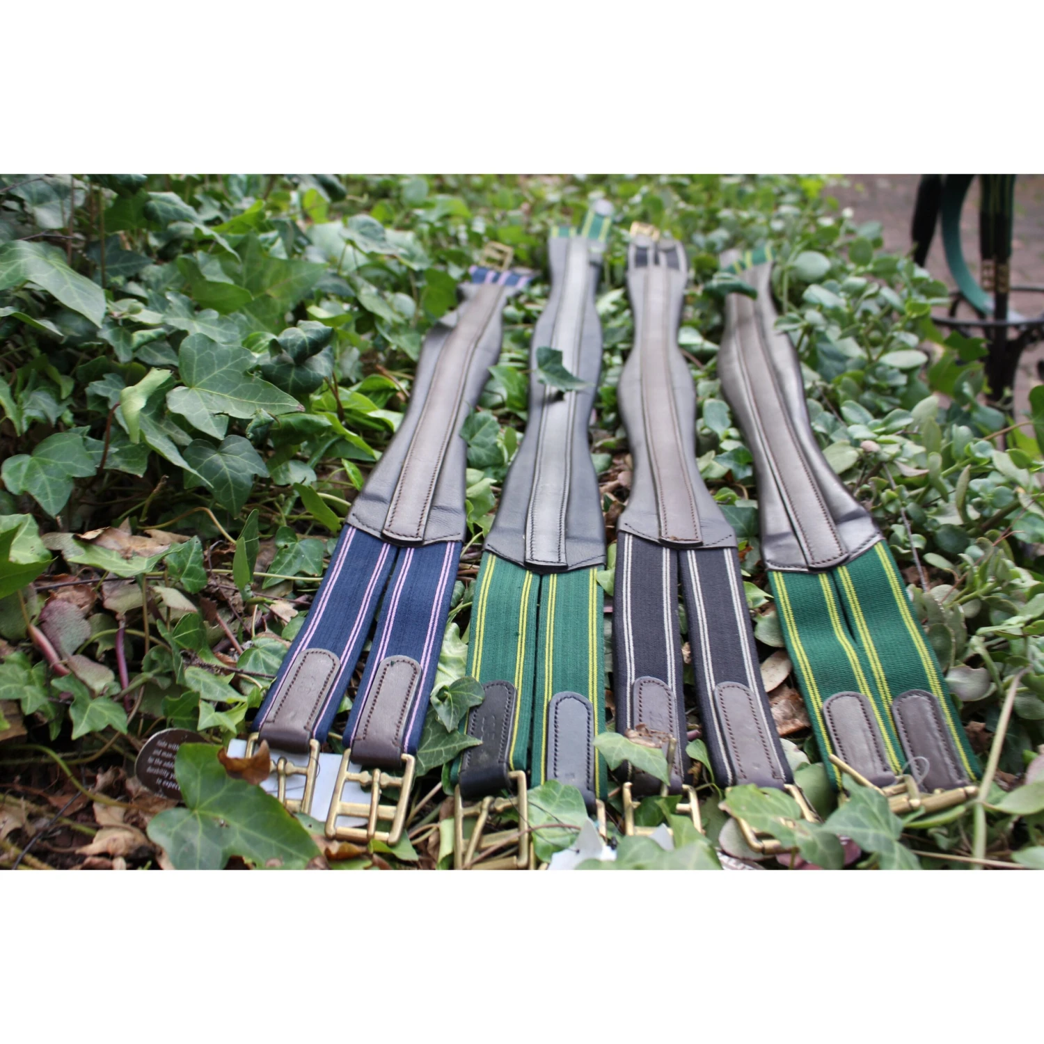 Available in black or brown leather in a range of sizes, with your choice of elastic colour: green/gold, navy/pink, black/tan.