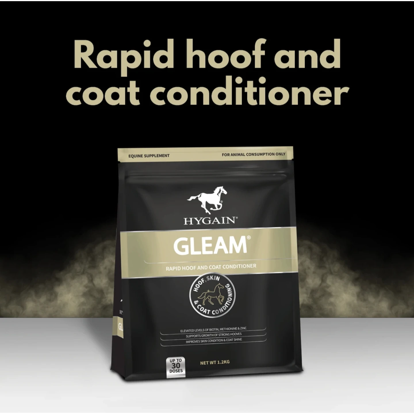 HYGAIN® GLEAM®, Rapid Hoof and Coat Conditioner is a blend of biotin, bio-chelated zinc, quality amino acids, full fat soya bean meal and essential fatty acids formulated in a palatable banana flavoured base for all equines.