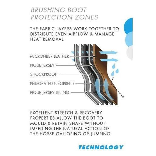 Developed to encourage airflow and to keep joints and tendons cool. The ventilation allows heat build up to escape and cold air to pass through. For maximum comfort we have lined the inside with our comfort dry lining (CDL). The splint and fetlock area are protected by a shockproof material and then covered by our carbon tech microfiber leather for extra protection. Easy single locking straps make this brushing boot user friendly and a brilliant choice for everyday use or for competitions.