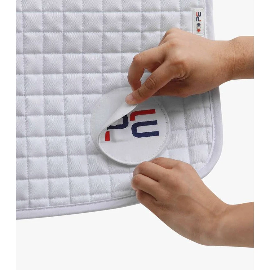 Each close contact cotton dressage competition saddle pad comes with 2 x PE patches and 2 x number patches that are attached either side of the pad onto integrated Velcro patches, compliant with the new British Dressage requirements.